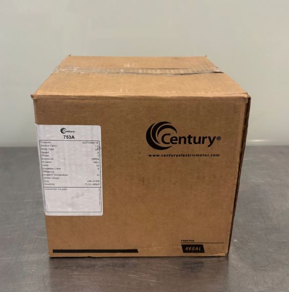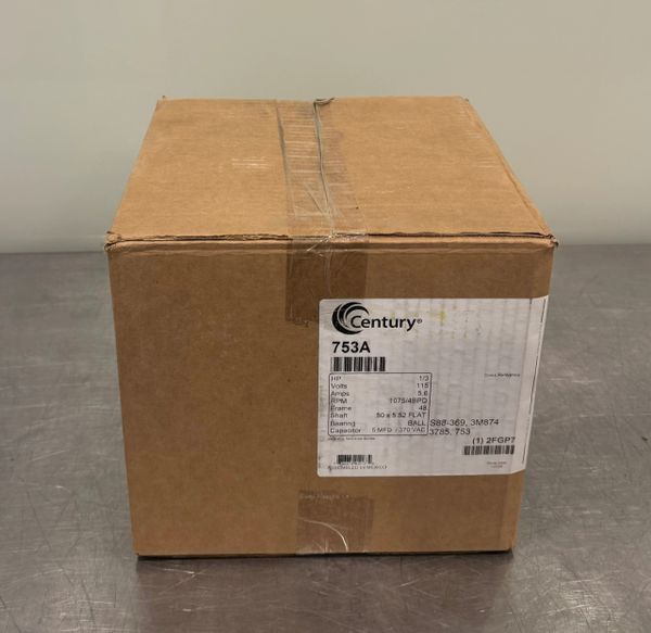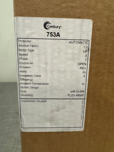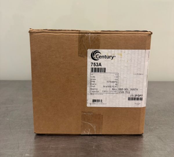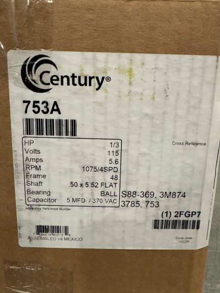 This is a new never used in original packaging Century 1/3 HP 115V 5.6A RPM 1075/4SPD Motor Model 753A