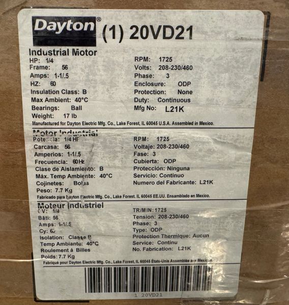 Dayton 20VD21 Motor 1/4 HP 1725 RPM 208-230/460V 3PH NEW IN BOX! FREE SHIPPING!