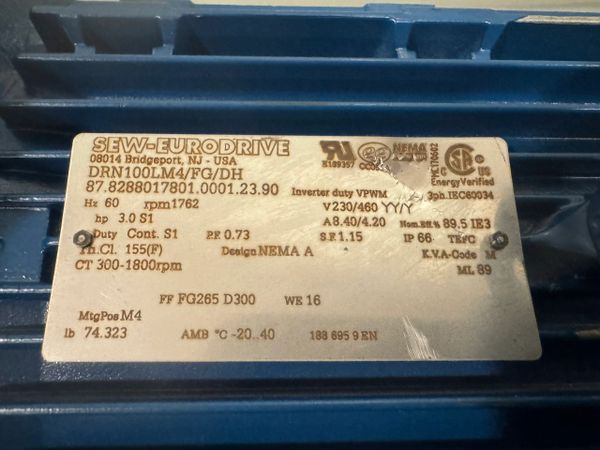 This is a new never used Sew Eurodrive 3HP 230/460V 1762 RPM Motor Model DRN100LM4/FG/DH