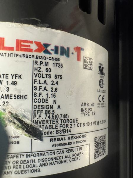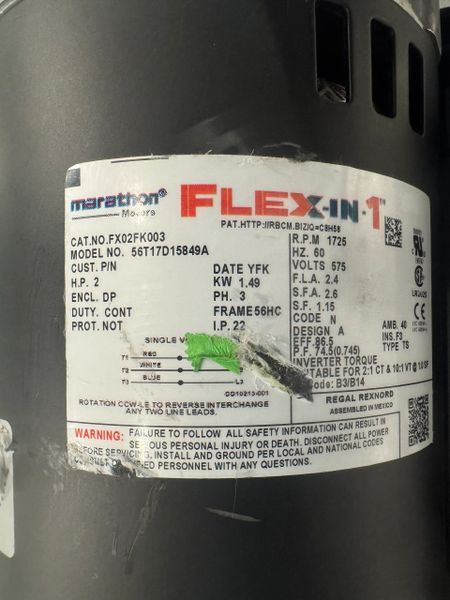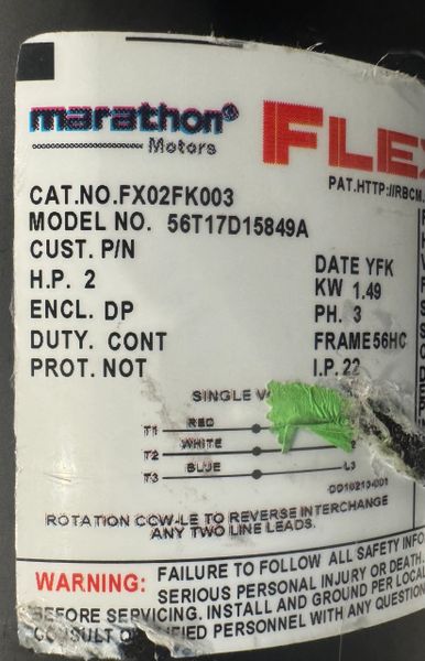 This is a new never used Marathon FLEX-IN-1 2HP 1725 RPM 3PH Motor Model FX02FK003