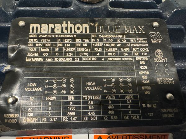 This is a new never used Marathon 3HP 230/460V 1800 RPM 3PH Motor Model Y527A (ZVM182THTCD8028AA)