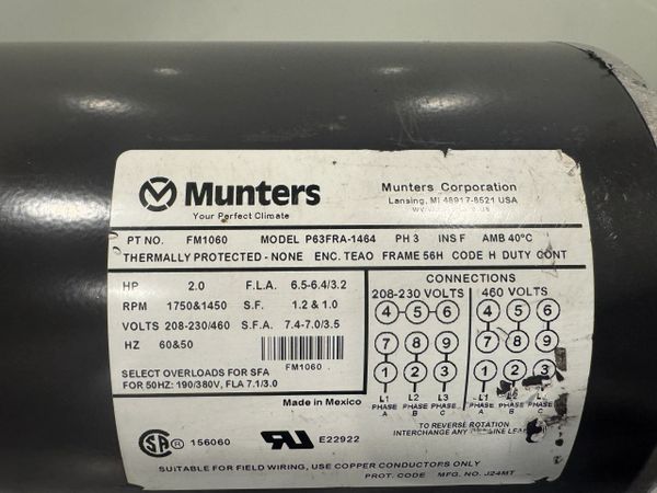 This is a new never used Munters 2HP 1750/1450 RPM Motor Model FM1060 (P63FRA-1464)