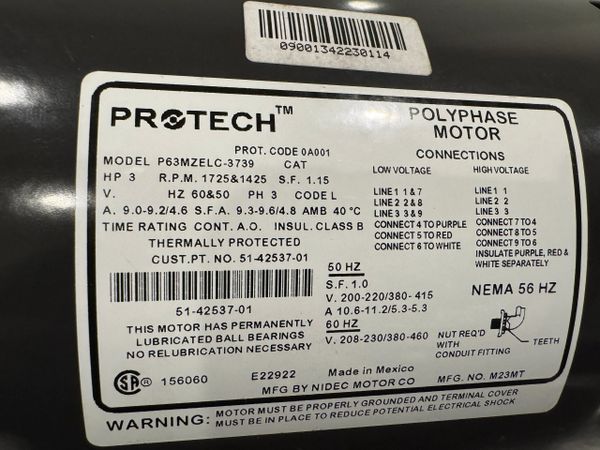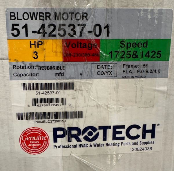 This is a new never used in original packaging Protech (Rheem) 3HP 1725 & 1425 RPM OEM Motor Model 51-42537-01 (M23MT)