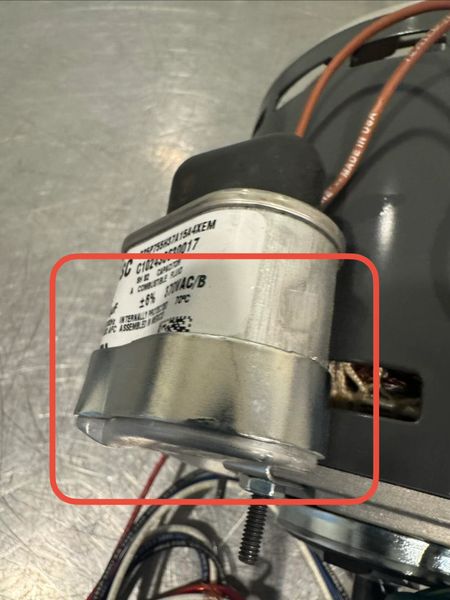 The items capacitor is dented (see picture 2). There is a dent on the rim of the motor (see pictures 9 & 10).