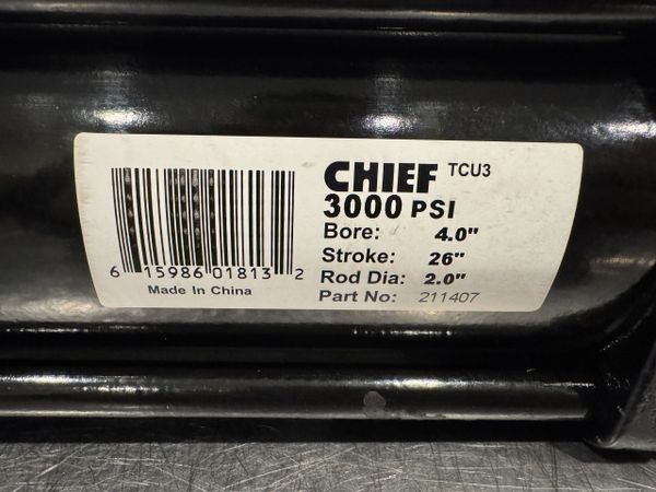 This is a new never used Chief 4” Bore 26” Stroke 2” Rod 3000 PSI Hydraulic Cylinder Model 211407