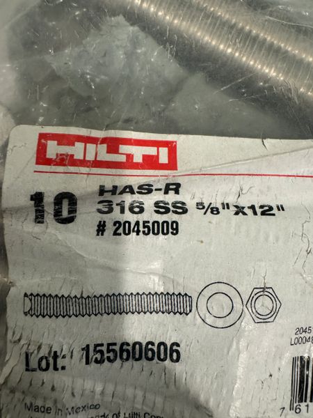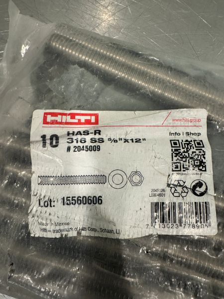• Hilti 2045009 HAS-R Anchor Rod 316 SS 5/8” X 12” 10 PACK NEW! FREE SHIPPING!